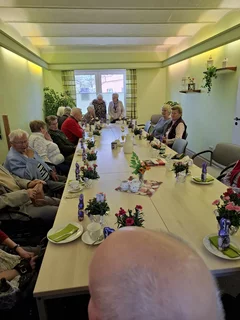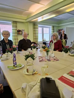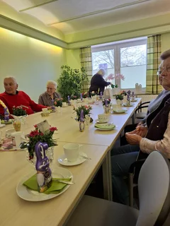 die Teilnehmer mit einem geschmückten Kaffeetisch. Blumen und